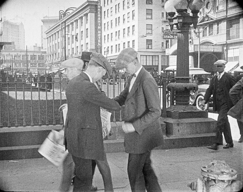 Directly accross the street from the “new” Chronicle building at 5th and Mission Street. In the background is the grounds of the “old” mint. Though replaced by the “new” mint at Duboce and Market Street in 1937, it was still in service as a mint during filming in 1925. Across the street and to the right of the men is the Pickwick Hotel which is still extant.