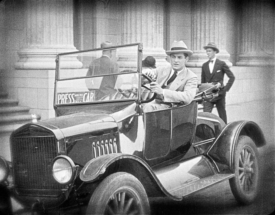 Clarence Walker (Rex Lease) in front of the Anglo California National Bank at 1 Sansome Street, corner of Sutter St. The shell of the old Anglo California National Bank is still intact and used as a plaza with the columns used to hold up the façade.