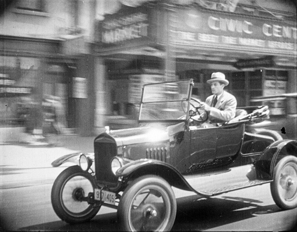 Clarence Walker (Rex Lease) near 8th and Market Street. Civic Center Market in background.