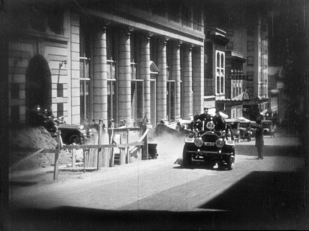 On Bush St. with fire engine going westbound. Fire station #2 (460 Bush Street) in background. Used as a fire station until 1970, though now converted to offices.
