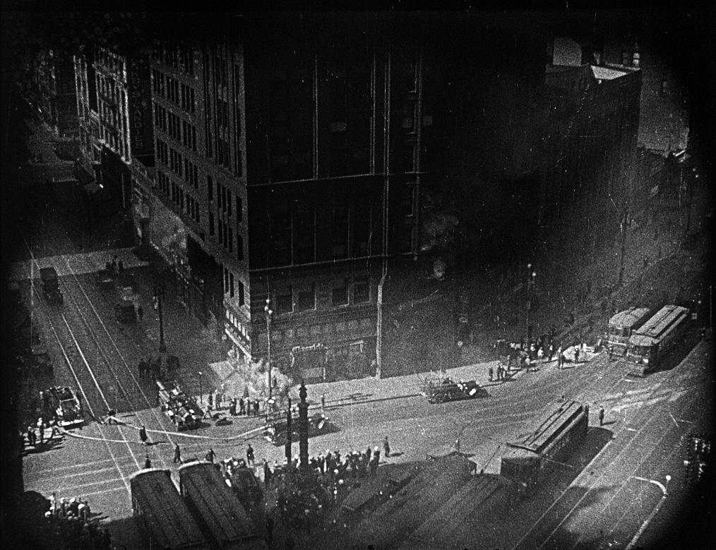 Old Chronicle building at the corner of Kearny, Geary and Market steets. Looking north.