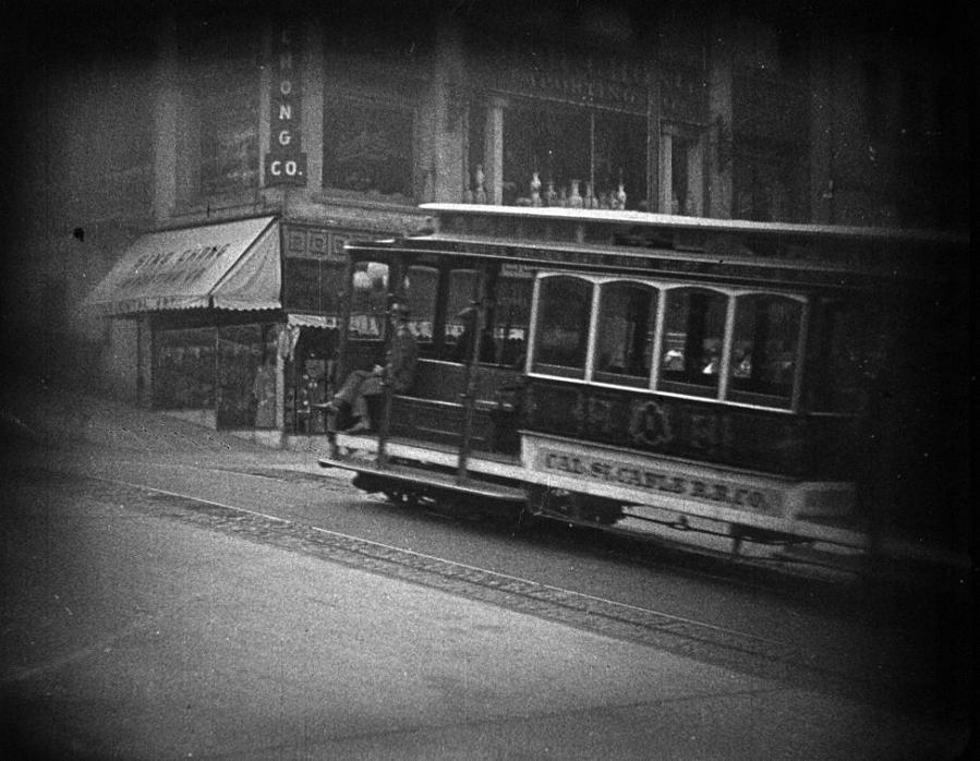 California and Grant Avenue., showing the cable car from the previous image arriving at Grant Avenue.