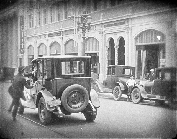 “Red” Moran leaps aboard a getaway vehicle outside the Mary Moll Building on Hollywood Boulevard. Streetlight is a style not used in San Francisco.