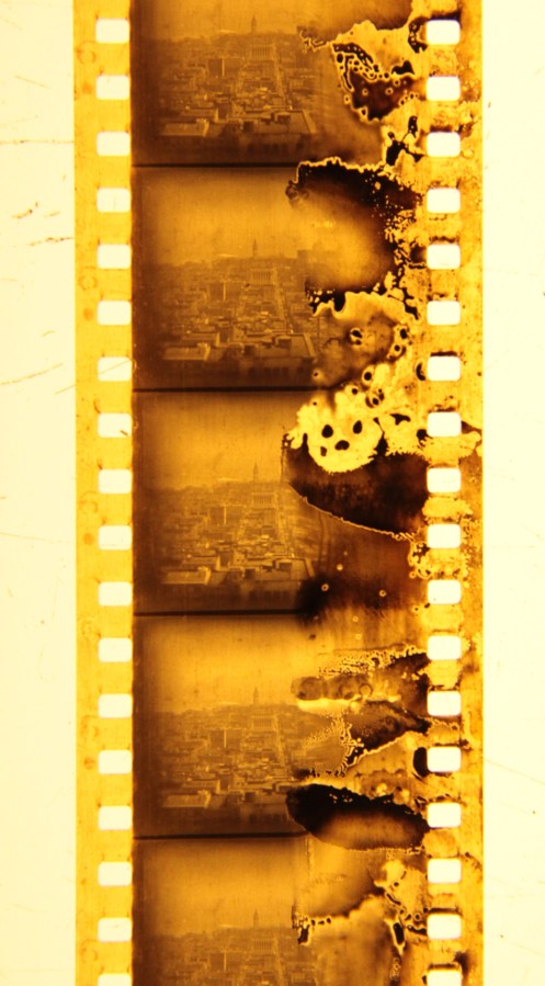 An aerial shot looking down Market Street. This section, taken from the beginning of the movie shows deterioration typical to nitrate film stock.